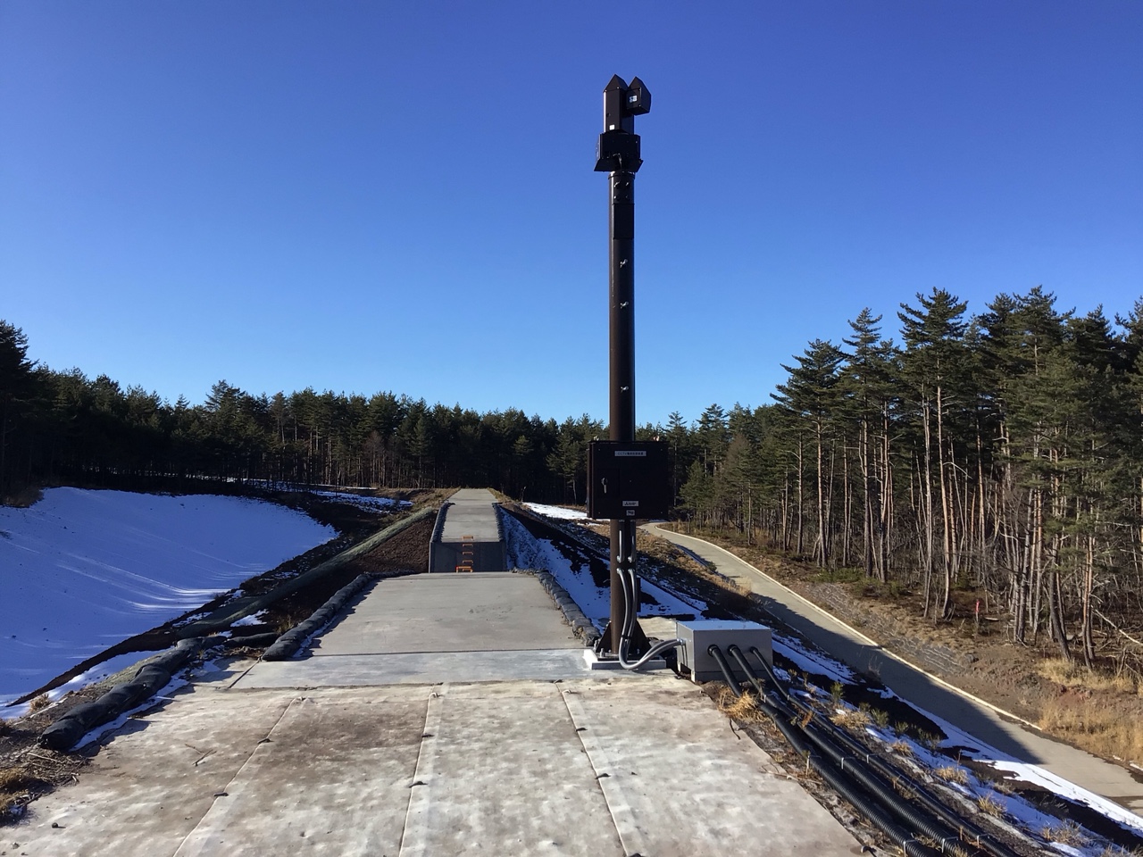 河川状況を監視する屋外高感度CCTVカメラ装置を小滝沢砂防堰堤に設置すると共に、カメラ装置間(約1.0km)の光ケーブル敷設を行い、通信ネットワークを構築しました。